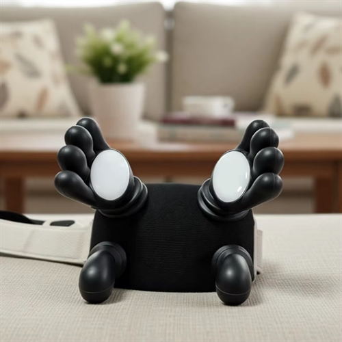 Massageapparat med håndformede massagehoveder i sort. Enheden har bløde, fleksible “hænder”, der kan give punktvis massage på fx nakke, skuldre, ryg eller ben. Betjenes via knapper på fronten, hvor man kan tænde, slukke og skifte funktion. Leveres med rem, så apparatet kan fastgøres omkring kroppen eller en stoleryg for mere stabil brug. Egnet til hjemmebrug som elektrisk massagehjælpemiddel.